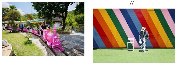 乡韵鹿境是福建省首家梅花鹿亲子主题乐园。看到奈良小鹿,大家忍不住要上前投喂一把。坐上小火车穿越度假区,体验帐篷下午茶、亲子游乐项目、萌宠乐园……这里处处都是网红打卡点。达人“熊修修bear”摆着酷酷的姿势,在彩虹墙前留影。