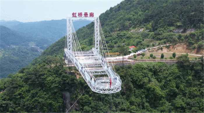 是的,景区里颇为壮观的,是落差108米的彩虹瀑布,还有超吉尼斯纪录8.4米的虹桥悬廊。达人们纷纷走上虹桥悬廊,合影留念。