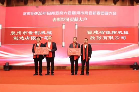 李奉恒为福建省铁拓机械股份有限公司颁发2025年度税收超2800万元牌匾;廖艺强为泉州市世创机械制造有限公司颁发2025年度税收超2000万元牌匾