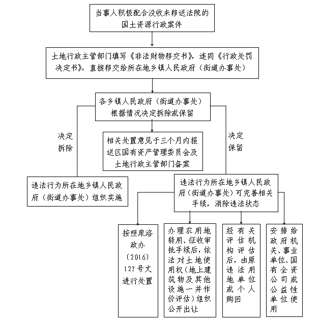 四、土地行政主管部门依法作出没收违法土地上建筑物和其他设施的行政处罚决定后,若当事人主动积极配合没收的土地行政案件,由土地行政主管部门将依法查处没收的地上建筑物和其他设施,按属地管理原则,直接移交违法行为所在地乡镇人民政府(街道办事处)进行管理和处置。