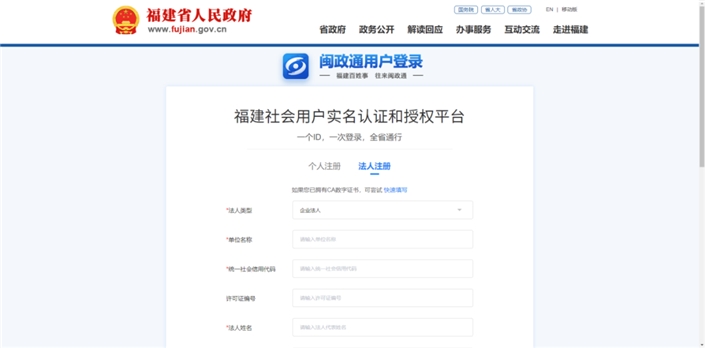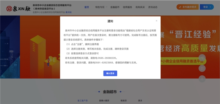 2.点击泉州市信易贷平台互联网门户网站右上角“企业登录”按钮。点击“确认登录”按钮,前往“福建省社会用户实名认证和授权平台”,依次填入相关信息,完成“法人用户”身份注册和认证,即代表完成了泉州市信易贷平台的注册和入驻。