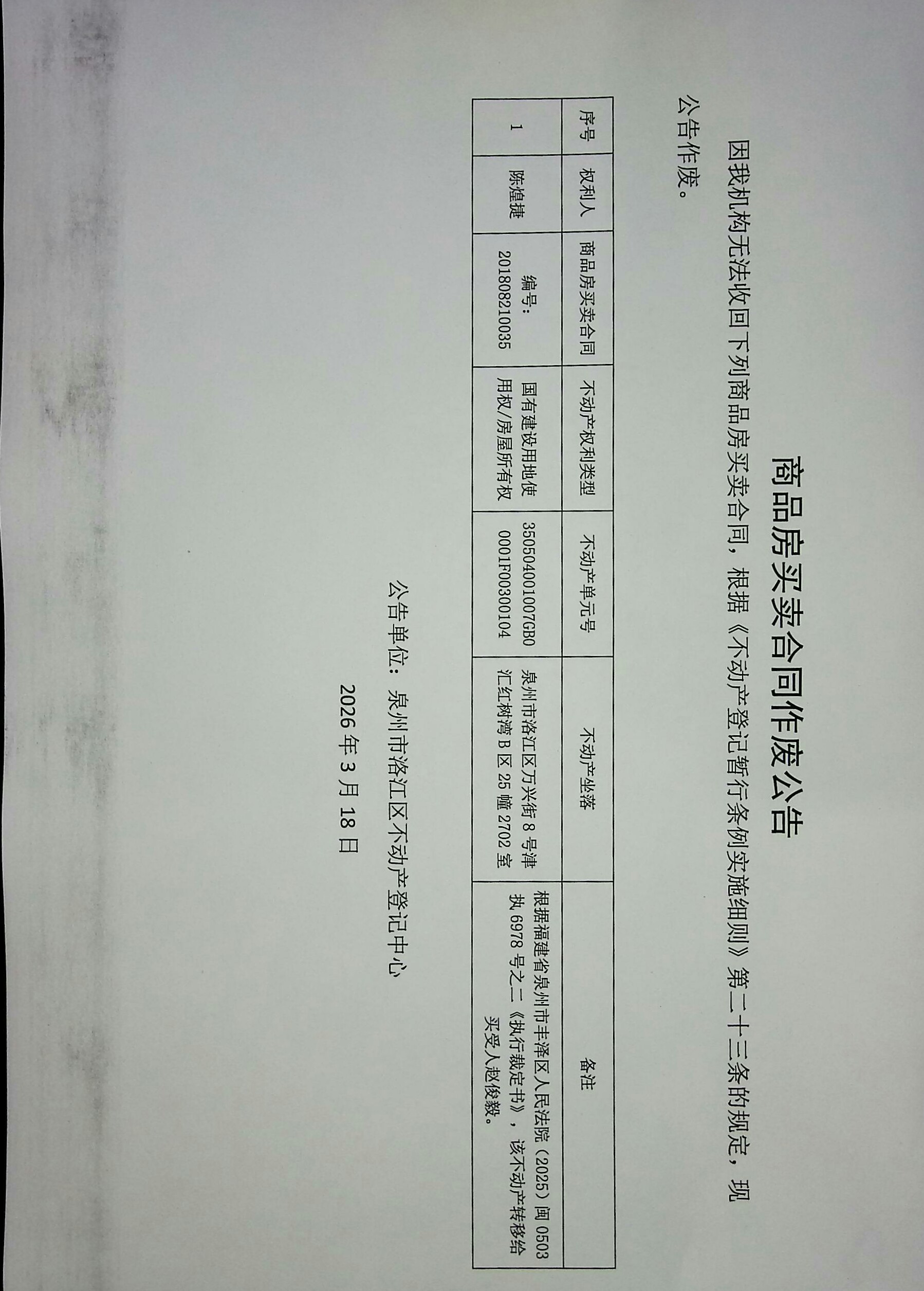 陈煌捷商品房买卖合同作废公告